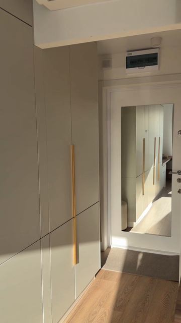 — Гардеробная очень вместительная и функциональная: есть полки под обувь, рейлы под верхнюю одежду, рубашки и платья, полки с автодовотчиком и открытые полки. Сверху зона хранения.